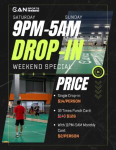 Want to smash all night long? ? Every Saturday night through Sunday early morning, CAN Sports Center is extending our prime Drop-In hours so you can enjoy more time on the court, more fun, and more rallies!